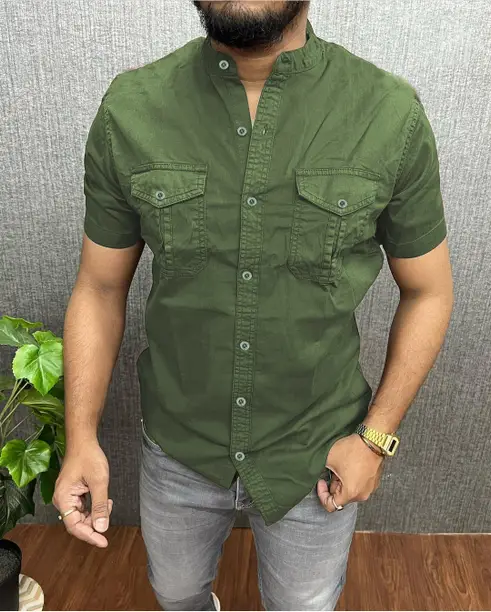 Men Regular Fit Solid Mandarin Collar Casual Shirt